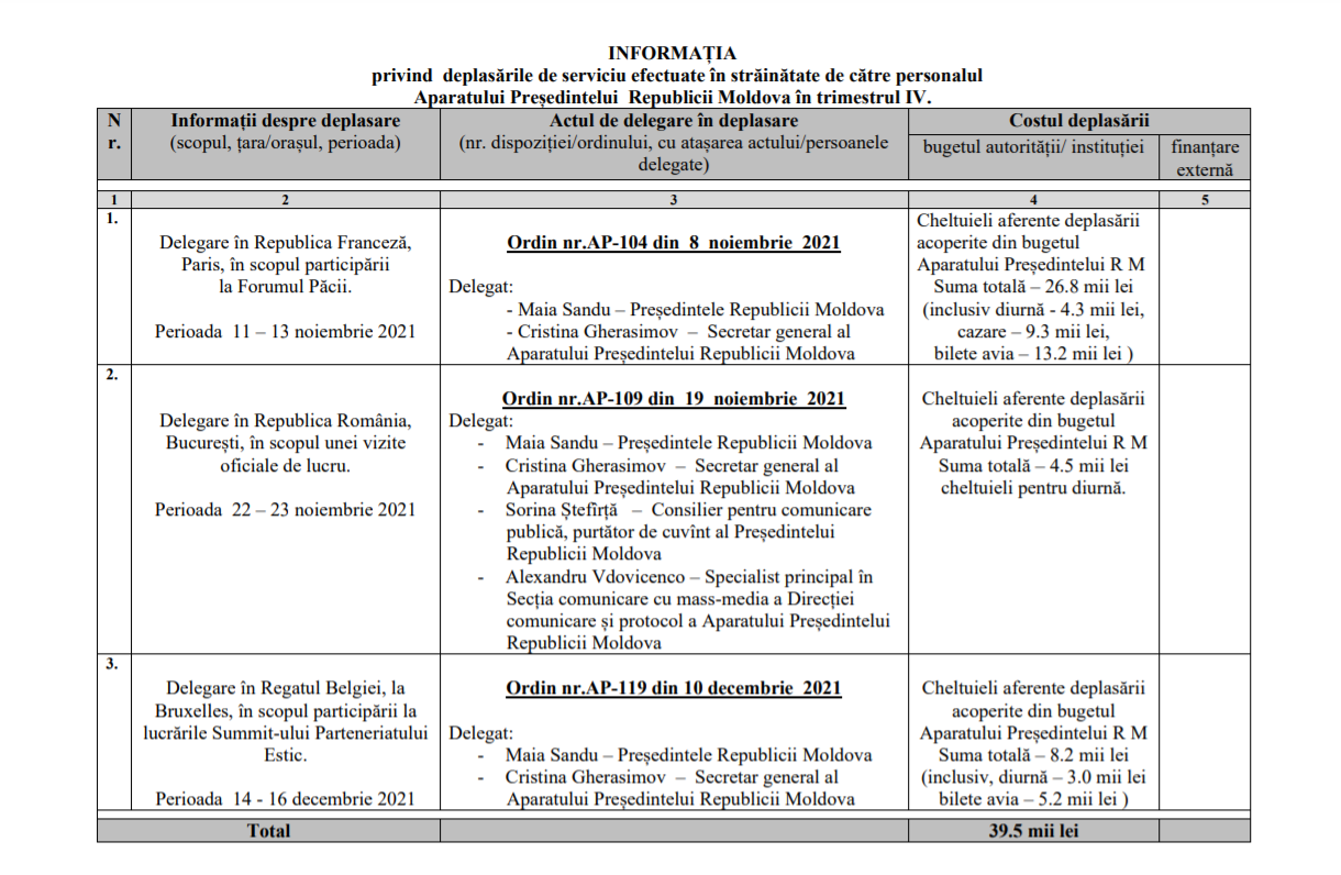 Aparatul președintei țării, Maia Sandu, a cheltuit în ultimele două luni ale anului trecut 39,5 mii de lei pentru deplasările de serviciu. Datele au fost prezentate de către Administrația Prezidențială în raportul privind deplasările de serviciu efectuate în străinătate de către personalul Aparatului președintei Republicii Moldova în trimestrul IV, scrie Realitatea.md.