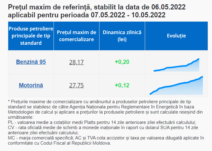 De menționat că, de la 1 septembrie 2021 au intrat în vigoare modificările la legea produselor petroliere, iar ANRE stabilește prețurile plafon pentru benzina cu cifra octanică 95 și pentru motorină.