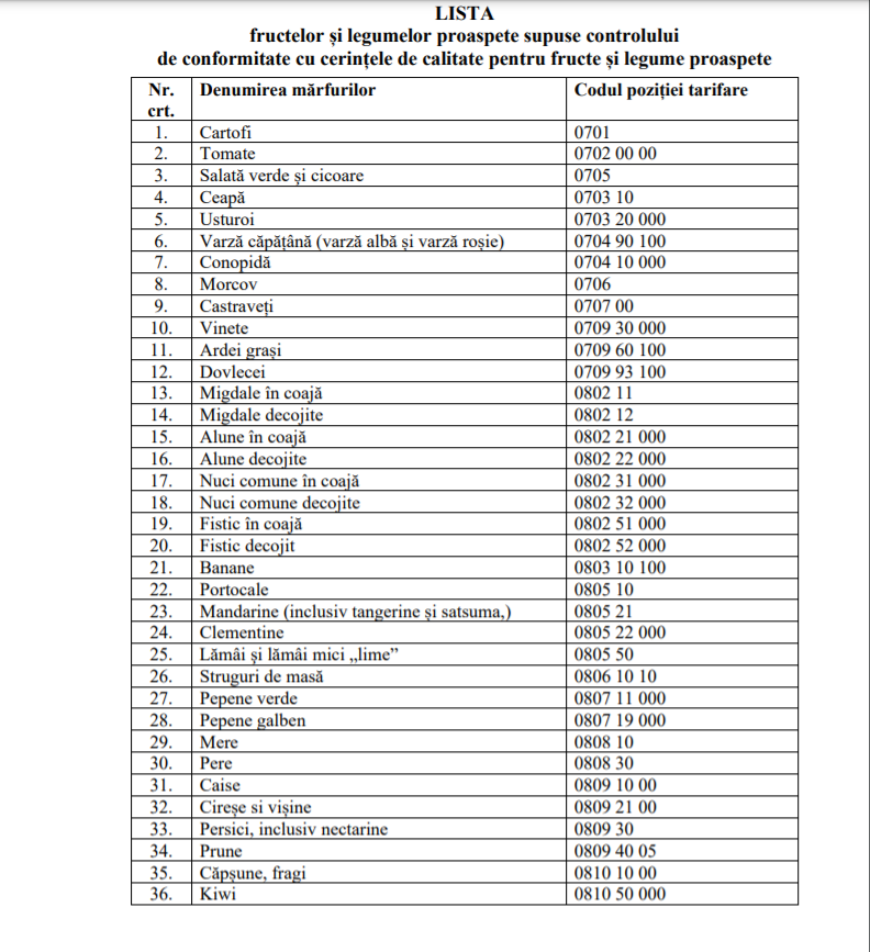 Documentul se referă la mai multe produse de larg consum de import sau autohtone (cartofi, ceapă, usturoi, varză, conopidă, morcov, castraveți, vinete, dovlecei, pepene verde, pepene galben, caise, prune, cireșe și vișine). Noile reguli au fost stabilite în conformitate cu Standardele adoptate de Comisia Economică pentru Europa a Organizației Națiunilor Unite (CEE-ONU).