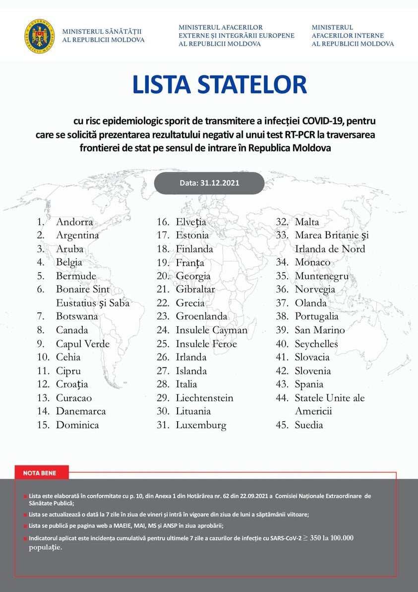 Lista statelor cu risc epidemiologic sporit de transmitere a COVID-19, clasificate ca Zonă Roșie a fost actualizată. Astfel, persoanele care vin în Republica Moldova din una din aceste țări sunt obligate să prezinte rezultatul negativ al unui test PCR.