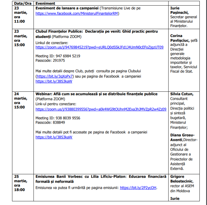 Săptpmâna viitoare vor avea loc o serie de activități dedicate tinerilor care vor să afle mai multe despre acumularea și distribuirea banilor publici. Activitățile vor fi organizate de Ministerul Finanțelor, Serviciul Fiscal de Stat, Serviciul Vamal, Centrul de Tehnologii în Finanțe în colaborare cu A.O FINEDU în cadrul Global Money Week 2021 (Săptămâna Internațională a Educației Financiare), cu genericul „Bugetul public este bugetul tău”.
