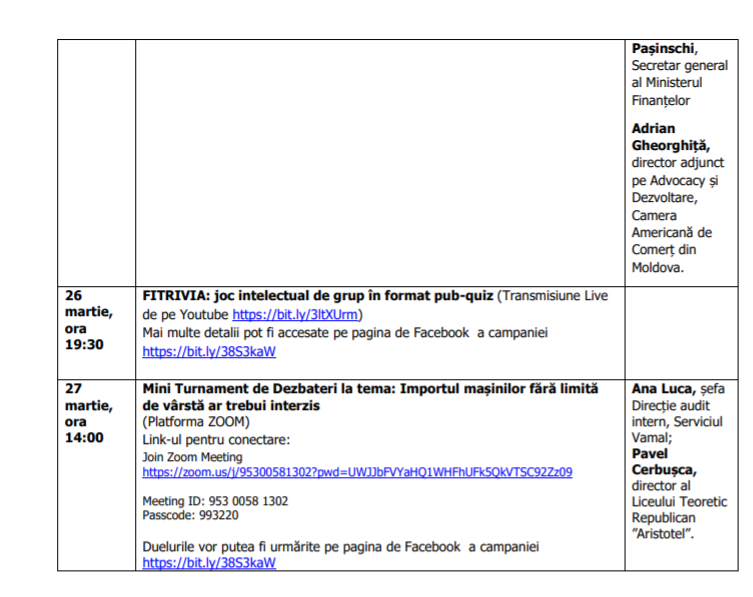 V. Mini Turnament de Dezbateri, în cadrul căruia va fi dezbătut subiectul: Importul mașinilor fără limită de vârstă ar trebui interzis. Evenimentul va fi comoderat de Ana Luca, șefa Direcției audit intern, Serviciul Vamal și Pavel Cerbușca, directorul Liceului Teoretic Republican Aristotel.