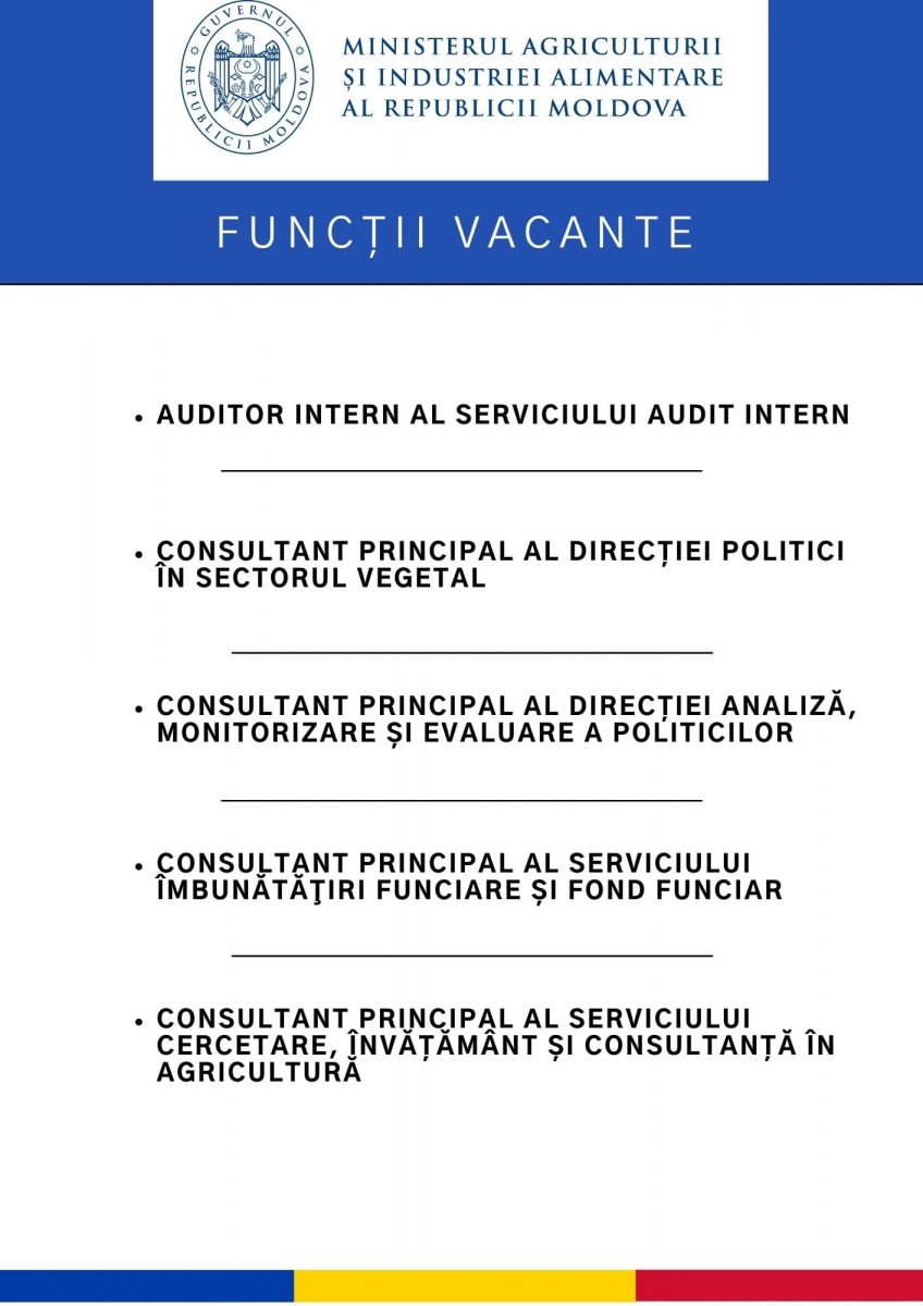 Ministerul Agriculturii şi Industriei Alimentare (MAIA) anunță concurs pentru ocuparea multor funcții vacante. Potrivit informațiilor, ministerul este în căutare de: auditor intern al serviciilor audit intern, consultant principal al direcției politici în sectorul vegetal, consultant principal al direcției analiză, monitorizare și evaluare a politicilor, consultant principal al serviciului îmbunătățiri funciare și fond funciar, consultant principal al serviciului cercetare, învățământ și consultanță în agricultură.