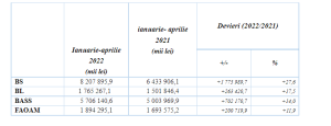 Încasările la Bugetul Public Național (BPN) administrate de Serviciul Fiscal de Stat au constituit 17,6 miliarde lei în 4 luni ale anului 2022, ceea ce denotă o creștere de 2940,3 milioane lei sau cu 20,1 % în raport cu perioada similară a anului precedent.