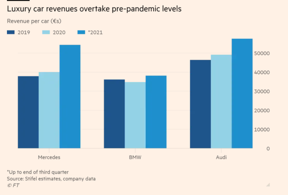 Într-o analiză realizată de Stifel Bank pentru Financial Times, se arată că, orice mașină vândută de BMW, Audi și Mercedes-Benz a adus un venit cu cel puțin 25% mai mare decât o vânzare făcută în 2019, înainte de pandemie. Asta se întâmplă în condițiile în care, în 2021 vânzările producătorilor auto au scăzut considerabil din cauza crizei de semiconductori.