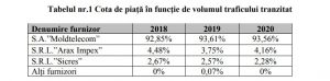 De asemenea, aşa cum se poate observa din tabelul de mai jos, S.A.”Moldtelecom” deţine în continuare o cotă de piaţă înaltă pe piaţa de tranzit de trafic în reţelele publice de telefonie, în funcţie de volumul traficului tranzitat, aceasta situându-se la nivelul de 93,56%.