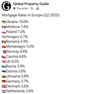 Republica Moldova se situează pe locul doi în Europa în privința celor mai ridicate dobânzi la creditele ipotecare, potrivit clasamentului publicat de portalul internațional Global Property Guide pentru trimestrul II al anului 2025.