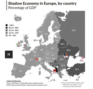 Republica Moldova se află pe primul loc în Europa la ponderea economiei tenebre raportată la PIB – 37,1%, potrivit datelor pentru anul 2025 publicate de mapsinterlude.