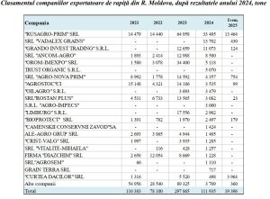 Statistica sezonului comercial care se încheie este, însă, mai puțin favorabilă: Moldova a exportat numai 110 129 t de rapiță (–60 % față de 2023/24), coborând pe locul 4 în topul furnizorilor UE cu o cotă de 1,4 %. Prețul mediu de export a urcat la 9,10 lei/kg, dar rămâne sub pragul de 11 lei/kg din 2022/23. „RUSAGRO-PRIM”, „VADALEX GRAINS” și „GRANDO INVEST TRADING” au dominat livrările din 2024, iar în prima jumătate din 2025 liderii s-au reconfigurat: „CURTEA DACILOR” și „AGRO-NOVA PRIM” au urcat în top alături de „RUSAGRO-PRIM”, cumulând 94 % din exporturi.