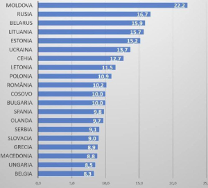 Țara noastră este urmată de Federația Rusă cu un indicator de 16,7%, Belarus – 15,9% , Lituania – 15,7% și Estonia – 15,2%.