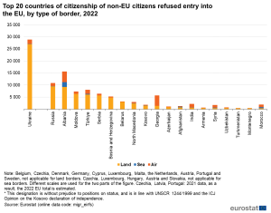 Informațiile că celor mai mulți cetățeni cărora li s-a refuzat intrarea în UE sunt ucrainenii (26 984), în timp ce numărul total de ucraineni refuzați intrarea în UE (prin orice mijloace) a fost de 28 890. Următoarele cifre cele mai mari de refuzuri au fost înregistrate pentru cetățenii din Albania (15 630) și Rusia (10 860). Cetăţenii ucraineni cărora li s-a refuzat intrarea în UE au încercat în principal să treacă graniţele terestre cu Ungaria şi Polonia şi, într-o măsură mai mică, cu România. Majoritatea cetățenilor albanezi li s-a refuzat intrarea la granițele terestre croate, maghiare sau grecești sau la granițele maritime și aeriene italiene. Majoritatea moldovenilor li s-a refuzat intrarea la granițele terestre românești, maghiare sau poloneze.