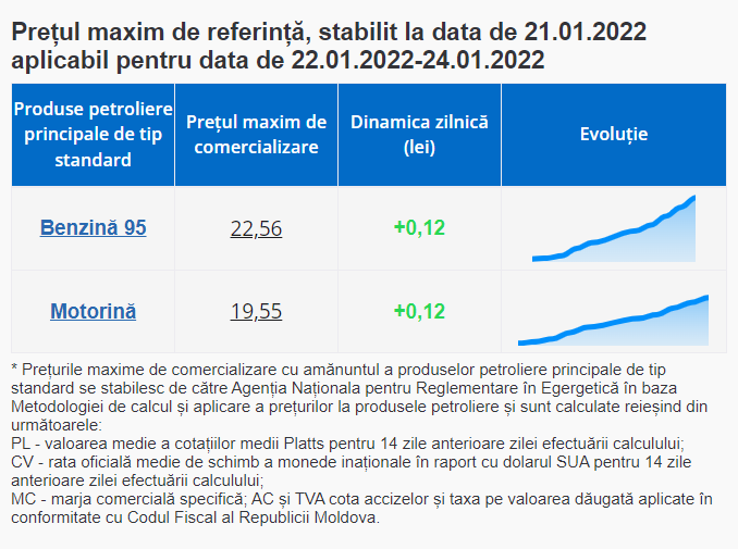 Astfel, mâine, 22 ianuarie 2022, litrul de benzină cu cifra octanică 95 va costa 22,56 de lei, iar cel de motorină – 19,55 lei.