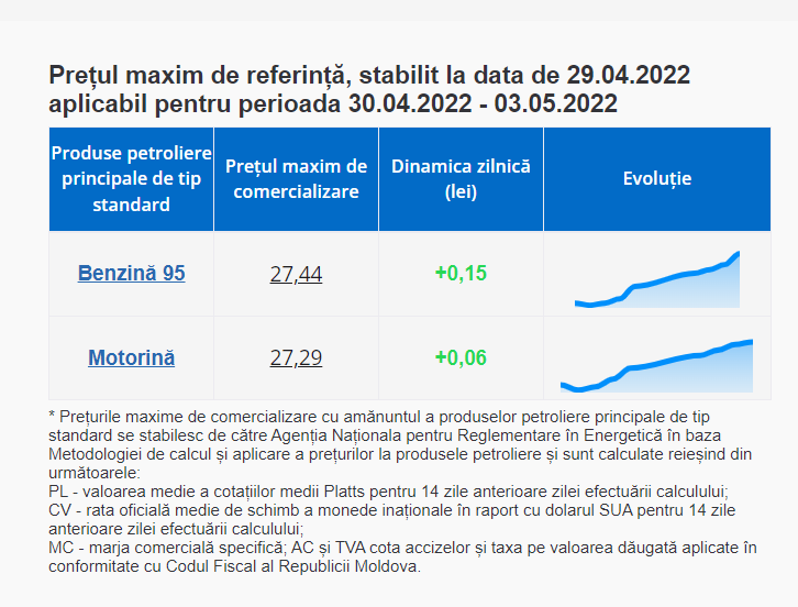 Agenția Națională pentru Reglementare în Energetică (ANRE) a afișat prețurile la carburanți: benzină și motorină pentru perioada 30 aprilie – trei mai. Prețul carburanților își continuă tendința de creștere. Mai exact, prețul benzinei va crește cu 0,15 lei, iar cel al motorinei va crește cu 0,06 lei.