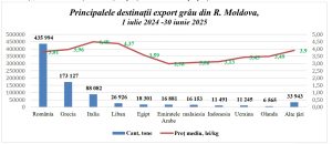 În sezonul iulie 2024 – iunie 2025, Moldova a exportat 838,7 mii tone de grâu, în scădere cu 37,5% față de sezonul precedent. Totuși, prețul mediu a crescut ușor cu 7,7%, ajungând la 3,88 lei/kg. Chiar și așa, valoarea totală a exporturilor a scăzut la 3,25 miliarde lei, cu 32,7% mai puțin decât în sezonul anterior, când încasările au atins un maxim istoric de 4,83 miliarde lei.