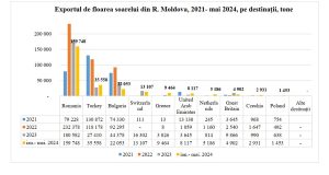 Destinațiile de export pentru floarea-soarelui rămân stabile. În primele 5 luni ale 2024 60 % din cantitate a fost vândută către România (159 748 tone), 13,2%- către Turcia (35 558 tone), 8,2%- către Bulgaria (22 053 tone). În același timp, în 2024 se observă o activizare a exporturilor de floare către destinația Turcia.