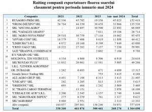 „În primele 5 luni ale anului 2024 în clasamentul companiilor exportatoare de floarea soarelui lider se poziționează compania Rusagro-Prim cu o cotă de aproximativ 17% (45 mii tone), fiind urmată de OromImpex cu o cotă de 13% (33,9 mii tone), Ancom-Agro cu o pondere de 9% (22,9 mii tone)”, potrivit analizei lui Iurie Rija.