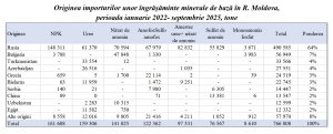 Originea mărfii evidențiază o dependență ridicată de Rusia: 64% din volumul total importat între 2022 și septembrie 2025 are origine rusă (livrările putând veni și prin intermediari), urmată de Bulgaria (7%), Turkmenistan și Azerbaidjan (câte 4%), respectiv Grecia (3%). NPK, amestecurile uree-nitrat și nitratul de amoniu provin covârșitor din surse rusești; Bulgaria furnizează mai ales nitrat de amoniu, iar Turkmenistanul și Azerbaidjanul – uree. Deși portofoliul s-a diversificat către 44 de țări, primele cinci origini acoperă încă ~85% din necesar, ceea ce păstrează vulnerabilitatea logistică la șocuri comerciale și geopolitice în regiunea Mării Negre.