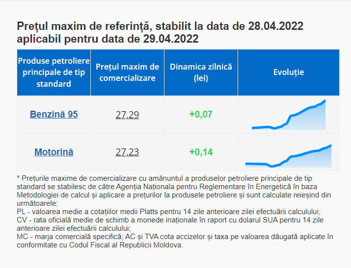 Astfel, mâine, 29 aprilie, un litru de benzină va costa 27,29 lei, iar un litru de motorină 27,23 lei.