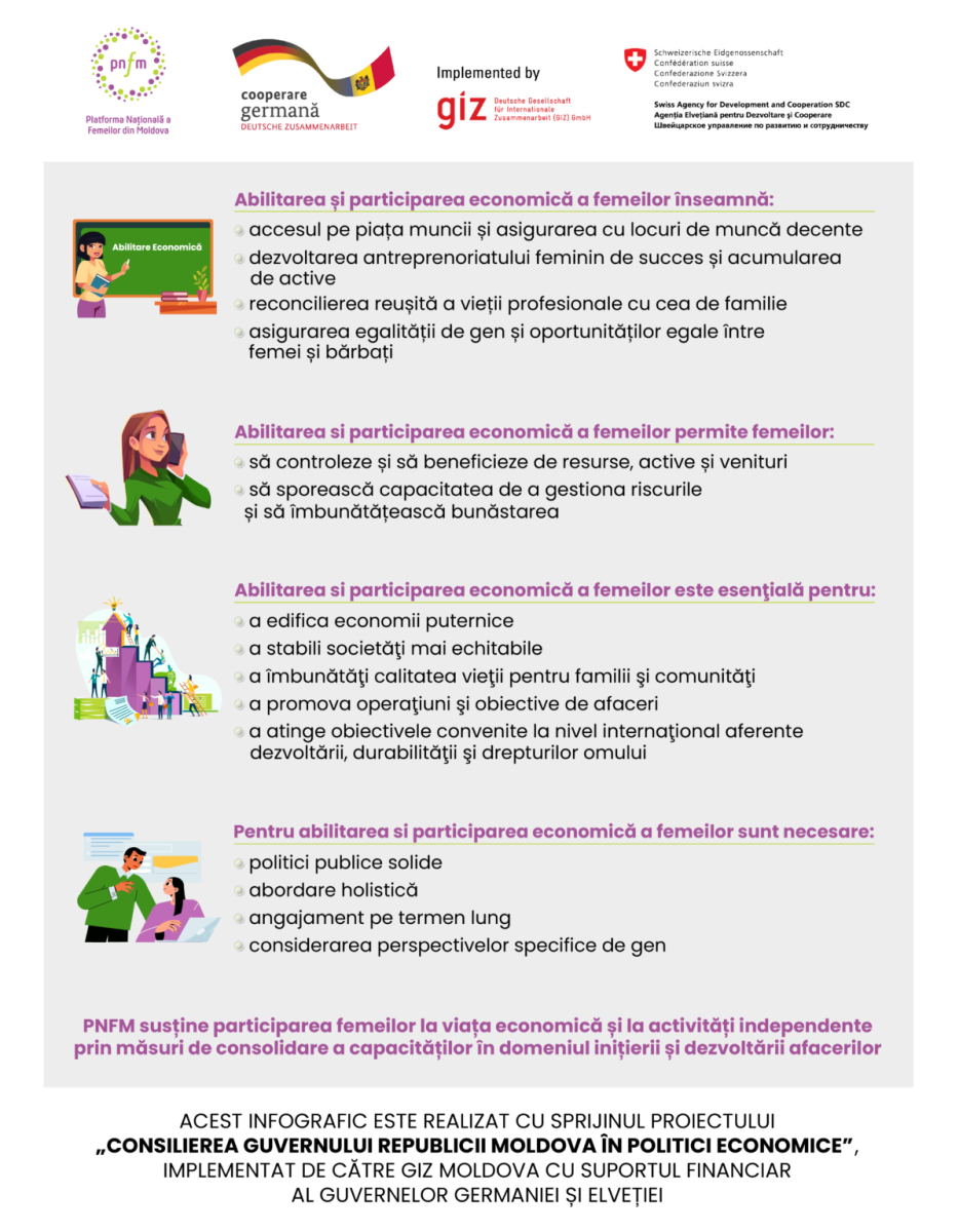 Platforma Națională a Femeilor din Moldova (PNFM) încurajează și susține participarea femeilor la viața economică și la activități independente prin măsuri de consolidare a capacităților și a cunoștințelor în domeniul inițierii și dezvoltării afacerilor, furnizare a serviciilor de mentorat și creșterea accesului la finanțare. În acest sens a fost realizat infograficul cu genericul „Abilitare și participare a femeilor”.