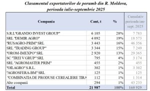 Ca urmare, valoarea totală a exporturilor de porumb s-a redus la 87,9 milioane lei în iulie–septembrie 2025 — cu 5% mai puțin decât în 2024 și de aproape cinci ori mai mică decât recordul din 2022, care a depășit 426 milioane lei. În luna septembrie, livrările externe au fost de doar 1 943 tone, cel mai scăzut nivel lunar din ultimii cinci ani.