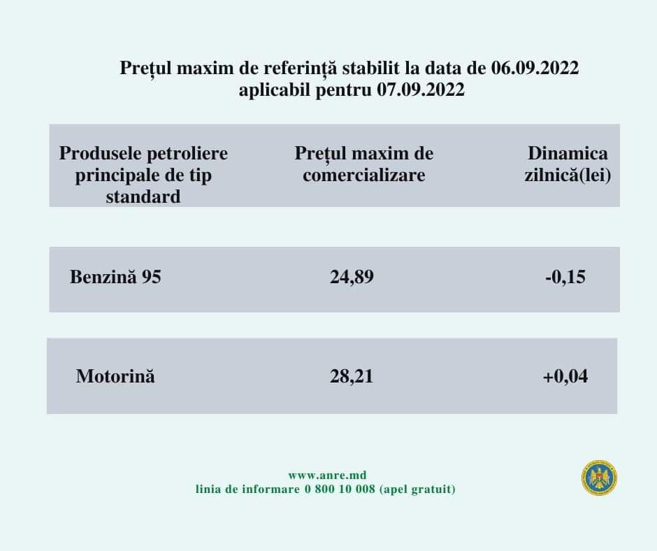 De menționat că, de la 1 septembrie 2021 au intrat în vigoare modificările la legea produselor petroliere. Așadar, ANRE stabilește prețurile plafon pentru benzina cu cifra octanică 95 și pentru motorină.