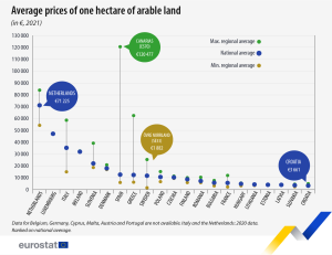 Însă Eurostat subliniază că această diferenţă este posibil să fie chiar mai mare deoarece pentru 2021 nu sunt disponibile date pentru toate statele membre, iar în 2020 preţul mediu al unui hectar de teren arabil în Ţările de Jos a fost de 71.225 de euro.