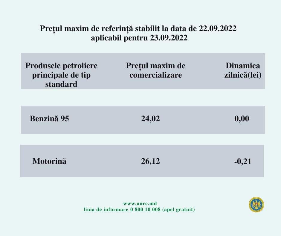 De menționat că, de la 1 septembrie 2021 au intrat în vigoare modificările la legea produselor petroliere. Așadar, ANRE stabilește prețurile plafon pentru benzina cu cifra octanică 95 și pentru motorină.