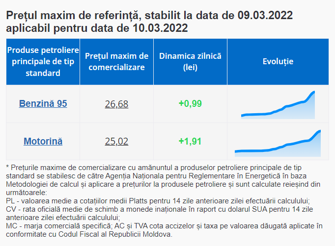 Agenția Națională pentru Reglementare în Energetică (ANRE) a anunțat prețurile la carburanți pentru data de 10 martie. În prezent asistăm l a o majorare fără precedent. Motorina s-a scumpit cu 1,91 lei, iar benzina cu 0,99 lei.