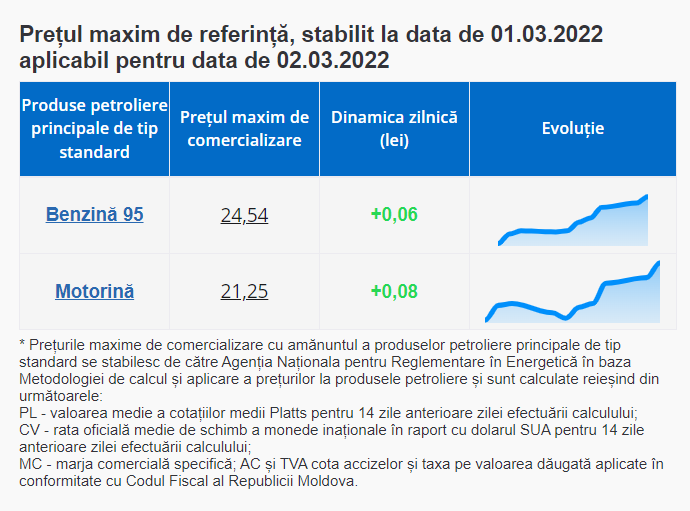 De menționat că, de la 1 septembrie 2021 au intrat în vigoare modificările la legea produselor petroliere, iar ANRE stabilește prețurile plafon pentru benzina cu cifra octanică 95 și pentru motorină.