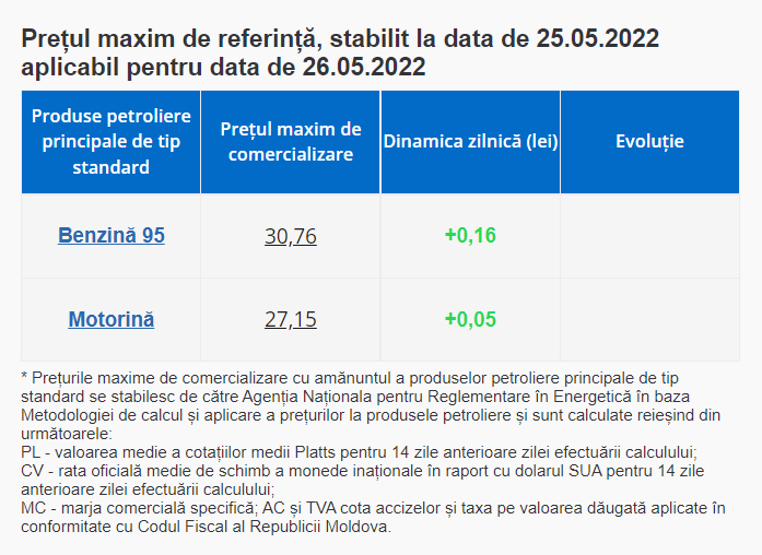 De menționat că, de la 1 septembrie 2021 au intrat în vigoare modificările la legea produselor petroliere, iar ANRE stabilește prețurile plafon pentru benzina cu cifra octanică 95 și pentru motorină.
