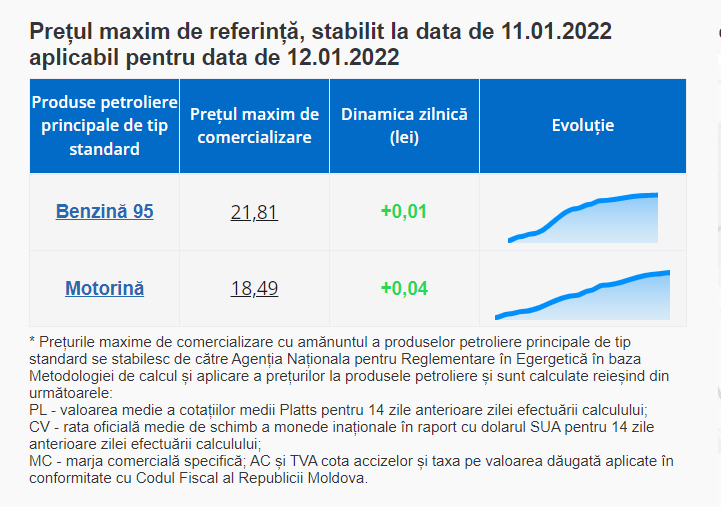 Agenția Națională pentru Reglementare în Energetică a Republicii Moldova (ANRE) a afișat pentru mâine, 12 ianuarie 2022, prețurile la benzină și motorină. Reglementatorul a aprobat costuri mai mari la benzină cu 0,01 bani, iar la motorină cu 0,04 bani.