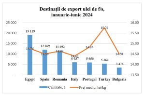 Destinațiile de export au suferit și ele modificări semnificative. Dacă în 2023, liderul absolut era România cu 196,4 mii tone, în primele șase luni din 2024 Egiptul a devenit principalul destinatar cu 19,1 mii tone, urmat de Spania (12 mii tone) și Italia (6 mii tone), iar România a coborât pe locul al treilea.