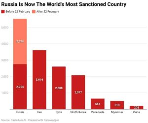 2.754 de sancțiuni erau deja în vigoare împotriva Rusiei înainte de 22 februarie. După invadarea Ucrainei pe 24 februarie, alte 2.778 de sancțiuni au fost impuse și au dus totalul la 5.532 – depășind cele 3.616 sancțiuni ale Iranului. Potrivit clasamentului, cele două state sunt urmate de Siria, Coreea de Nord, Venezuela, Myanmar și Cuba.