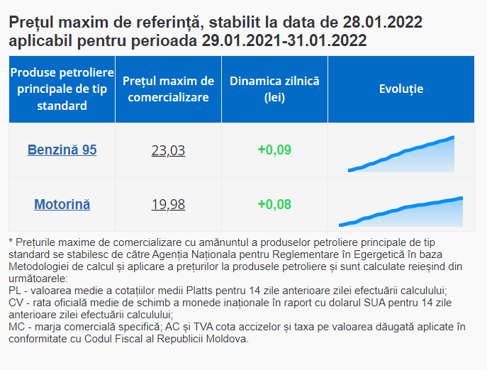Agenția Națională pentru Reglementare în Energetică (ANRE) a afișat prețurile la carburanți, benzină și motorină pentru perioada de 29 -31 ianuarie 2022. Prețurile cresc în continuare și au înregistrat un nou record. Potrivit ANRE, Prețul la benzină s-a majorat cu 0,09 lei, iar pentru motorină cu 0,08 lei.