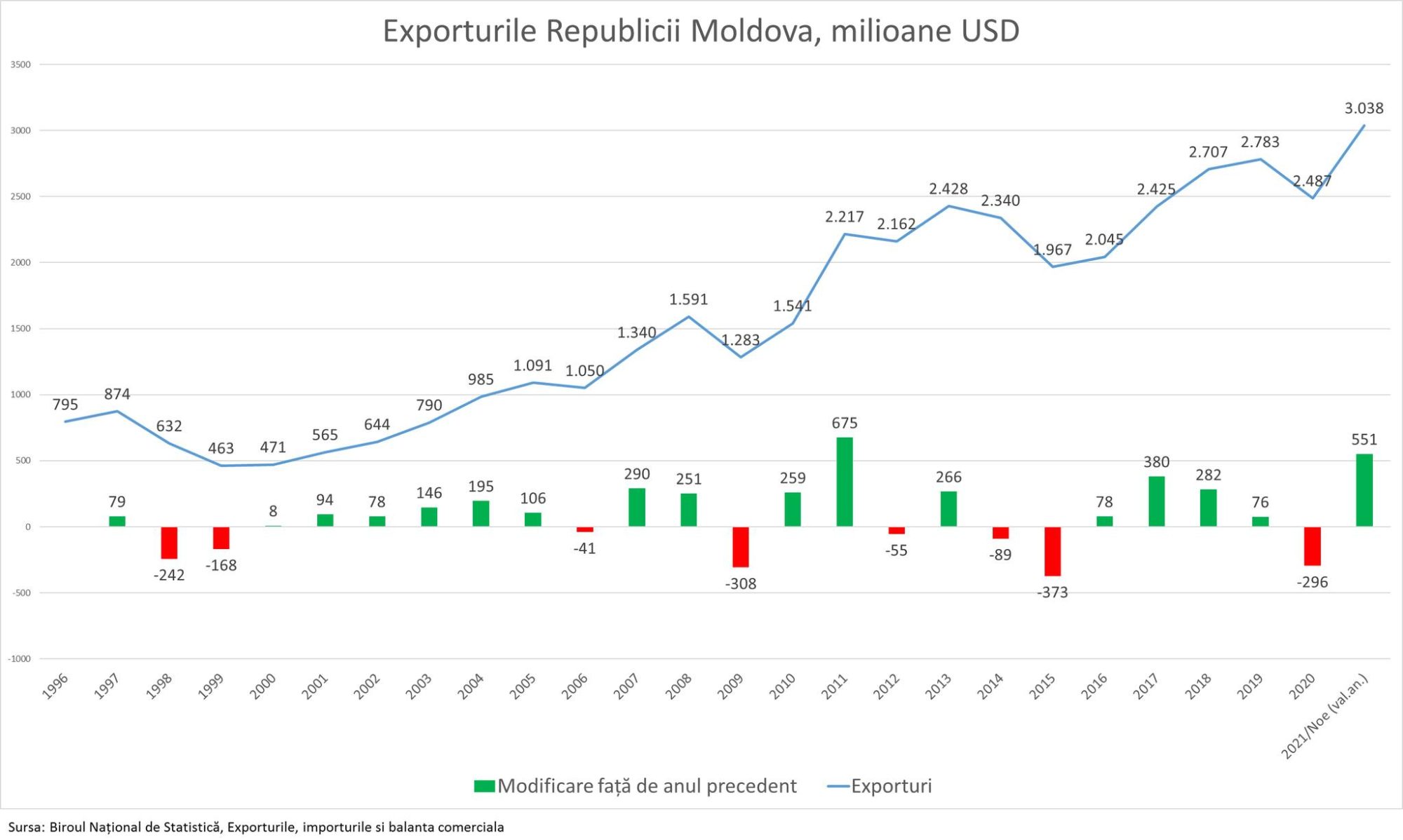 Într-o postare pe Facebook, expertul economic Veaceslav Ioniță informează că, în perioada ianuarie – noiembrie 2021, exporturile moldovenești au trecut pragul de 3 miliarde USD în valoare anuală. Potrivit expertului, creșterea față de anul 2020 va fi de cel puțin 600 de milioane USD.