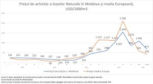 Astfel în ultimii 2,5 ani, Moldova a plătit un preț mediu ponderat de 570 USD/1000m3, iar prețul mediu european în această perioadă a fost de 880 USD/1000m3.