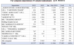 În ceea ce privește clasamentul importatorilor, compania „AGROCENTER EUROCHEM” SRL domină piața în 2024 cu 5 150 tone, urmată de S.R.L. „CARVIDON-TRADE” cu 3 609 tone și S.R.L. „PIRAMIDA-MARKET” cu 1 008 tone.