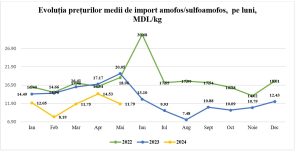 Potrivit lui, în primele cinci luni ale anului 2024, această tendință s-a accentuat, cu o valoare medie de import de 10,18 lei/kg, reflectând o reducere de 16,14% față de anul precedent. Luna februarie a marcat cel mai bun preț din 2024, înregistrând 8,19 lei/kg și importând cea mai mare cantitate de îngrășământ, respectiv 6 302 tone. De la începutul primăverii, prețurile au început să crească, atingând în luna mai valoarea de 11,79 lei/kg. În primele 5 luni ale anului curent, importurile au totalizat 11 046 tone de îngrășământ amofos/sulfoamofos, aproape aceeași cantitate ca și în perioada similară din anul trecut.