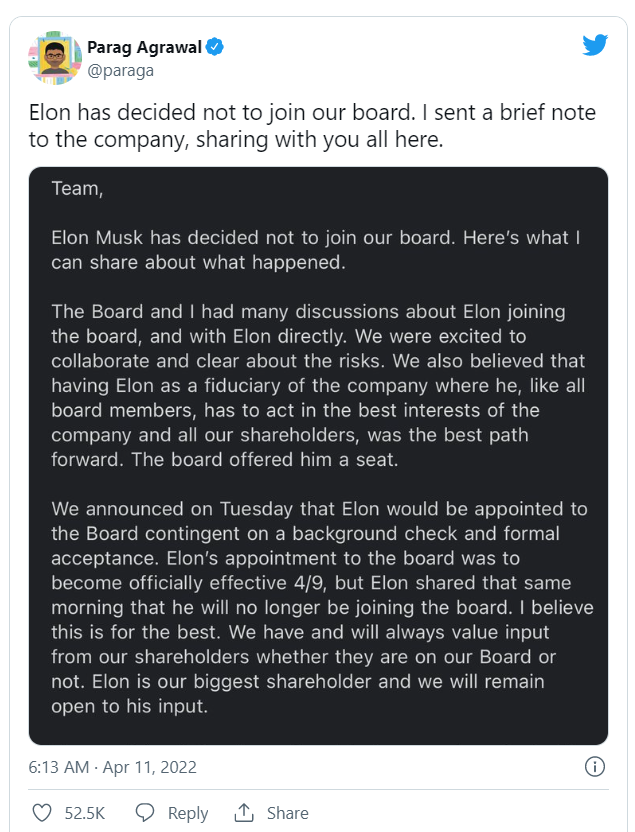 Cu toate acestea, Agrawal a postat pe Twitter: „Elon a spus în aceeași dimineață că nu se va mai alătura consiliului de administrație”.