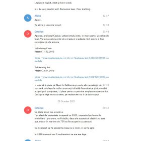 „Apropo, proiectul Codului urbanismului este, in mare parte, un rahat de lege. Varianta optimă este de a traduce și adapta nițel aceste 2 legi estoniene și a le adopta. Se poate si un tax incentive: * pt cladirile proiectate începând cu 2025, impozitul pe bunurile imobiliare / pe avere, va fi dublu, daca ele acoperișul clădirii nu este apt, măcar în mărime de 75% să fie acoperit cu panouri”, îi sugerează Cazac lui Alaiba cum să modifice Codul de urbanism.