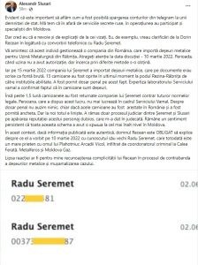 „Însă peste 1,5 lună camioanele au fost returnate companiei lui Șeremet contrar tuturor normelor legale. Persoana, care a dispus acest lucru, nu mai lucrează în cadrul Serviciului Vamal. Despre dosar penal nu auzim nimic, chiar dacă acele camioane au fost arestate în România și a fost pornită ancheta. Dar la noi totul e liniște. A rămas doar procesul judiciar dintre Șeremet și Slusari pe apărarea reputației acestui personaj dubios, care m-a dat în judecată. Rămâne un sentiment persistent că toata aceasta schema a avut o крыша la cel mai înalt nivel în Moldova”, a punctat Sluasri.