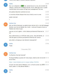 Astfel, într-o discuție, din septembrie 2021, cu Andrian Gavrilița fostul șef al cabinetului ex-premierului Chiril Gaburici, Alaiba îi spune cum vor fi chemați șefii de la CNPF la comisiei și vor fi f……. Gavrilița îi spune că nu poate veni lșa ședința comisiei pentru că nu l-ar lăsa conducerea GIZ (deține funcția de Policy Adviser la GIZ).