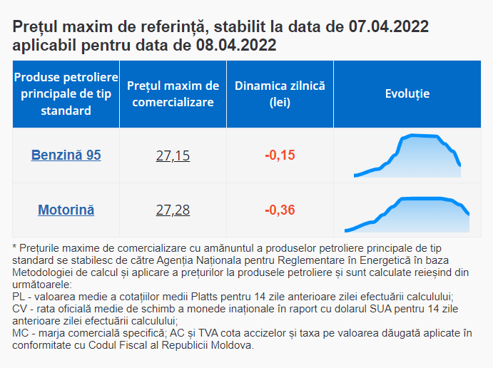 De menționat că, de la 1 septembrie 2021 au intrat în vigoare modificările la legea produselor petroliere, iar ANRE stabilește prețurile plafon pentru benzina cu cifra octanică 95 și pentru motorină.