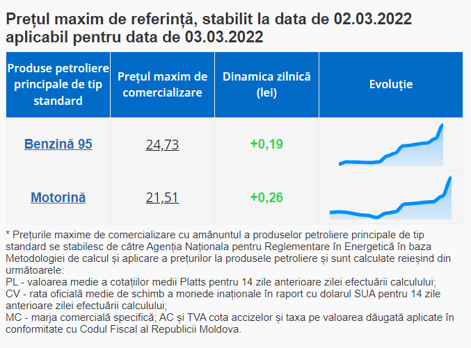 De menționat că, de la 1 septembrie 2021 au intrat în vigoare modificările la legea produselor petroliere, iar ANRE stabilește prețurile plafon pentru benzina cu cifra octanică 95 și pentru motorină.
