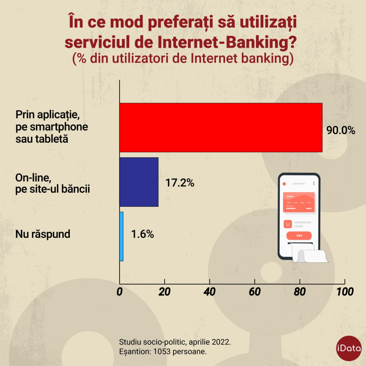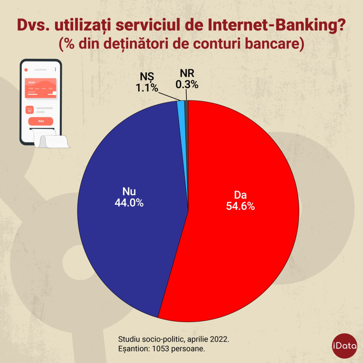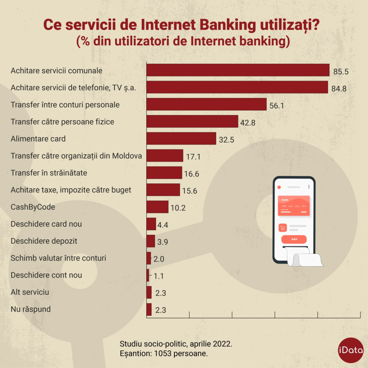 În aprilie 2022, iData a realizat un nou sondaj socio-politic pe un eșantion de 1053 de persoane. Conform rezultatelor, peste 55% dintre moldoveni folosesc Internet Banking. Majoritatea achită serviciile comunale și de telefonie.