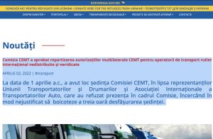 La data de 1 aprilie a.c., a avut loc ședința Comisiei CEMT, în lipsa reprezentanților Uniunii Transportatorilor și Drumarilor și Asociației Internaționale a Transportatorilor Auto, care au refuzat prezența în cadrul Comisie, încercând în mod nejustificat să boicoteze a treia oară desfășurarea ședinței.”