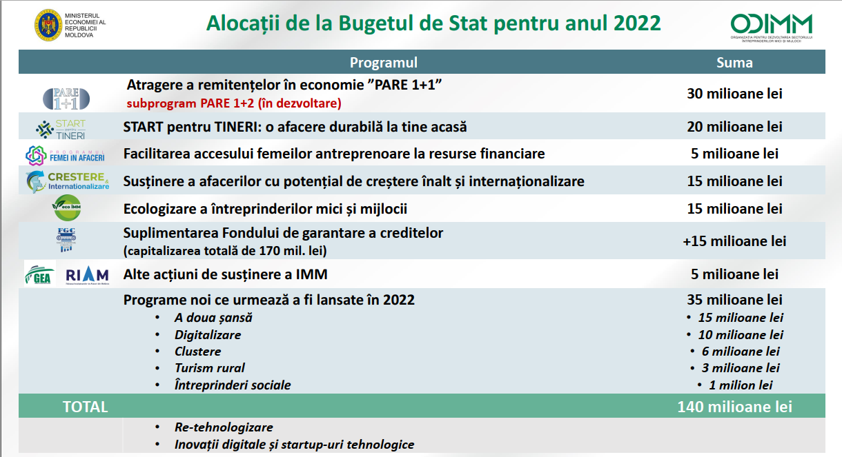 Ministerul Economiei, prin intermediul Organizației pentru Dezvoltarea Întreprinderilor Mici și Mijlocii (ODIMM), va oferi în anul curent un suport financiar în valoare de circa 140 milioane lei mediului de afaceri. Dintre acestea, 85 milioane lei vor fi alocate direct antreprenorilor prin intermediul a 6 programe de stat existente, extinse și prin intermediul a 5 programe noi în proces de dezvoltare. Alte 15 milioane lei vor fi direcționate către majorarea fondului de garantare a creditelor.
