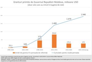 „Cel mai mult Moldova a beneficiat de granturi din partea partenerilor externi în perioada 2008-2015, când anual suma granturilor depășea nivelul de 100 milioane USD. În anul 2014 a fost atins recordul absolut, când suma granturilor a ajuns la 288 milioane USD. În perioada 2009-2019 peste 2/3 din tot suport extern oferit Moldovei a fost sub formă de granturi. Spre regret această performanță nu a fost atinsă nici până, nici după această perioadă. În toți acești ani, până acum, Moldova a beneficiat doar pentru suportul bugetar de 1,9 miliarde USD sub formă de granturi. Suma totală a granturilor este mult mai mare, deoarece o parte considerabilă din ele au fost gestionate direct de către donator”, a punctat Ioniță.