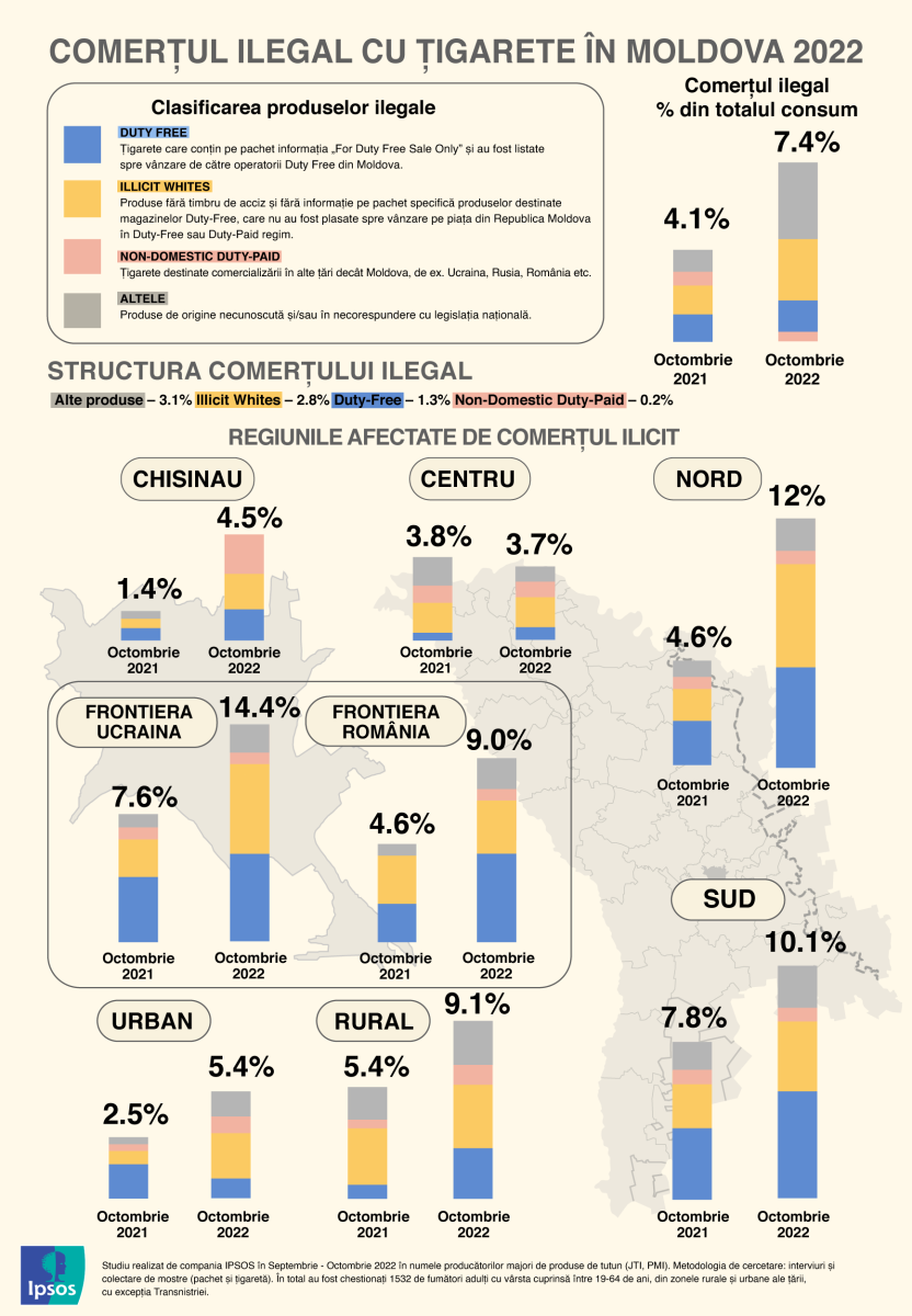 Rezultatele studiului mai arată o dublare a comerțului ilicit cu produse de tutun în regiunile situate la frontiera cu Ucraina, de la 7,6% la 14,4%, afectând localitățile Briceni, Dondușeni, Căușeni, Ocnița, Soroca, etc., dar și în regiunea de nord a țării, unde piața neagră a produselor de tutun a crescut de la 4,6% la 12%. De asemenea, de la 4,6% la 9% a crescut comerțul ilegal la frontiera cu România, în localitățile Hîncești, Nisporeni, Ungheni, Edineț, Leova, etc, scrie Mold Street.