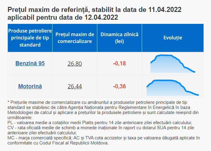 De menționat că, de la 1 septembrie 2021 au intrat în vigoare modificările la legea produselor petroliere, iar ANRE stabilește prețurile plafon pentru benzina cu cifra octanică 95 și pentru motorină.